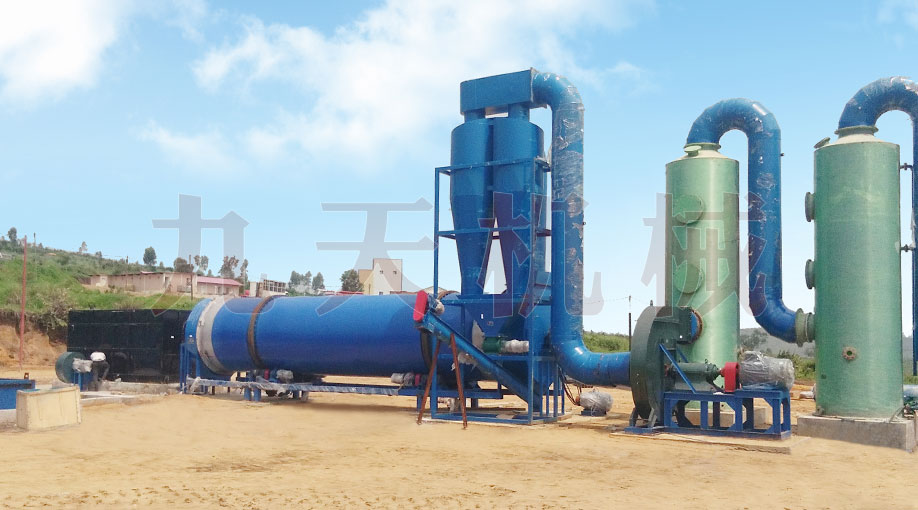 氣體流程是:空氣經(jīng)熱風(fēng)爐鼓風(fēng)機(jī)加壓進(jìn)入熱風(fēng)爐燃燒加熱,溫度達(dá)到600-950℃,被烘干機(jī)后引風(fēng)機(jī)吸入烘干機(jī)烘干物料、蒸發(fā)水分,經(jīng)過三層換熱,風(fēng)溫溫度降低到55-60℃排出烘干機(jī),含塵濕氣經(jīng)過旋風(fēng)除塵器收塵、濕式除塵器凈化達(dá)標(biāo)排放。